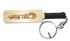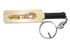 Mini Wooden Cricket Bat Keyring with metal keychain. Can be branded with a print, a sticker or engraving. Cost effective cricket related promotional item. Size of bat is 5cm in length with a black grip.